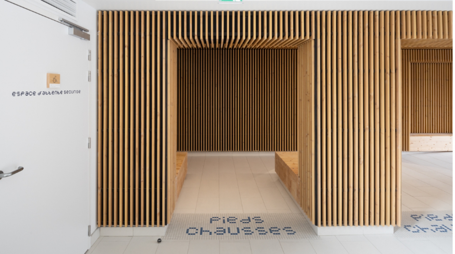 另一个重点是恢复舒适、安全且符合现行卫生和可达性标准的接待与流通空间。为实现节约建造的目标,项目采用了升级改造流程。屋架的每根梁都被拆卸、运离现场,然后交付给Mathis公司的车间。该公司筛选出部分构件,交由室内木工公司Bonnardel,利用这部分木材为大厅(接待柜台)和泳池大厅(长凳)制作家具以及标识牌支架。与此同时,Mathis在车间预制了可移动屋顶新结构的12个拱架和各类檩条——材料为来自孚日山脉和汝拉山脉生态认证森林的道格拉斯松胶合木——通过卡车运输并在现场组装。大厅的翻新也改善了照明、声学效果和接待条件。