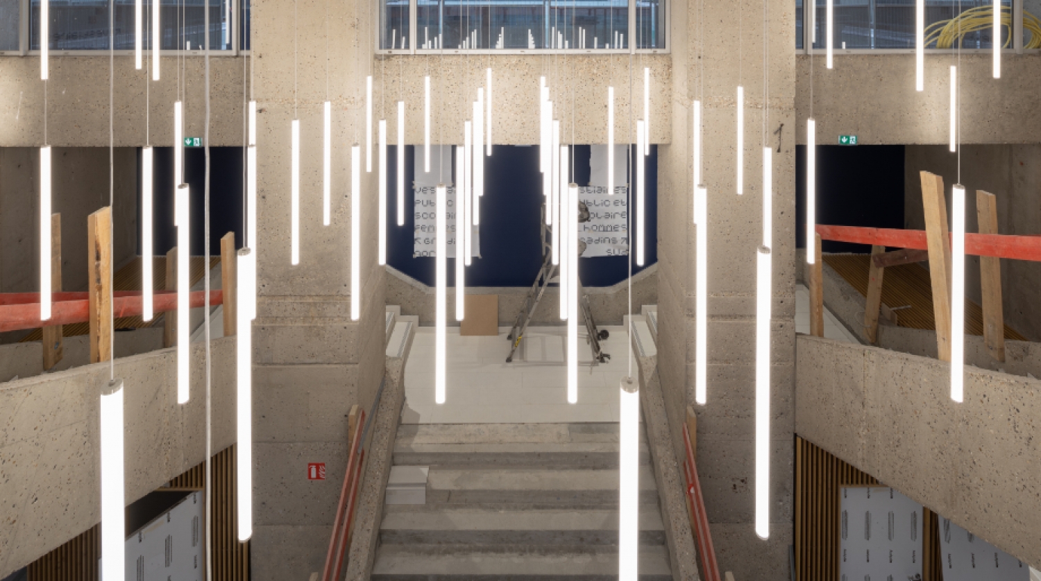 工程于2022年9月开始,首先在特定区域进行了为期四个月的清淤和污染治理,最终于2024年3月完成。受损部分(如瓷砖和隔墙)被拆除,同时,泳池大厅的现有屋架于2023年1月开始拆除,并在看台上搭建了脚手架。这些脚手架作为工作平台,用于清理高位构件(檐沟等)、灯具、通风系统和经过防锈处理并重新漆成白色的钢结构屋架。混凝土构件(柱子、梁等)的病害得到了逐一处理,泳池不防渗的水槽也进行了重建。随后,在弧形屋顶下方张挂了防坠网,以便拆除屋顶覆盖层(聚碳酸酯板)和木结构屋架。可移动屋顶是该项目建筑理念的一个重点,这一真正的创新让游泳者能享受自然空气和光线,现已得到全面修复。